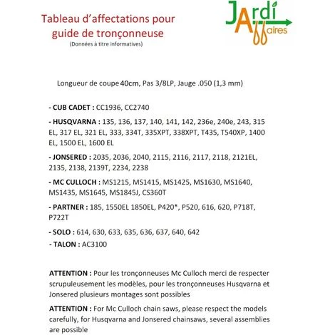 Guide Oregon 160SDEA095 pour tronçonneuse d’une longueur de coupe de 40 cm. Pas 3/8 »LP, Jauge 1,3mm. Ce guide s’adapte essentiellement sur les tronçonneuses de marques : CUB CADET, HUSQVARNA, JONSERED, MC CULLOCH, PARTNER, SOLO et TALON Ce guide se monte généralement avec une chaine de 56 maillons entraineurs (dents qui entrent dans le guide). Voir tableau d’affectation par marques et modèles en photo sur la fiche produit. Merci de respecter nos préconisations ou de nous contacter en cas de doute.