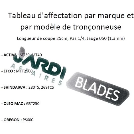Guide Oregon 100SDAA041 longueur de coupe 25cm, Pas 1/4, Jauge 050 (1.3mm) se monte généralement avec une chaine à 58 ou 60 maillons entraineurs (dents qui entrent dans le guide) Référence Oregon 100SDAA041 ou 509788 (référence gravée sur le guide d’origine), SHINDAIWA X101-000090. On retrouve ce guide principalement sur les tronçonneuses des marques ACTIVE, EFCO, SHINDAIWA, OLEO MAC, OREGON (voir tableau d’affectation par modèle en photo ATTENTION : Merci de respecter le tableau d’affectation en photo et de vous assurer de votre Pas de chaine ainsi que de la référence du guide d’origine avant de passer commande