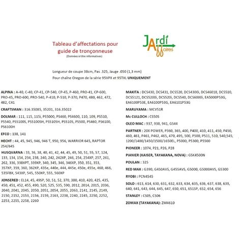 Guide Oregon 150TXLGK095 longueur de coupe 38cm, Pas 325 Microlite, Jauge 1,3mm généralement monté avec une chaine de 64 maillons entraineurs (dents qui entrent dans le guide). Convient aux tronçonneuses ALPINA, CRAFTSMAN, DOLMAR, EFCO, HECHT, HUSQVARNA, JONSERED, MAKITA, MARUYAMA, OLEO MAC, PARTNER, PIONEER, PIANIER, RED MAX, RYOBI, SOLO, STANLEY, ZOMAX… ATTENTION : Merci de respecter notre tableau d’affectation (en photo), convient UNIQUEMENT à de la chaine Microlite (gouge étroite Oregon) Peut se monter à la place du guide 150TXLBK095 dont la roulette est plus petite 10 dents (nez étroit) au lieu de 12 pour le modèle 150TXLGK095.
