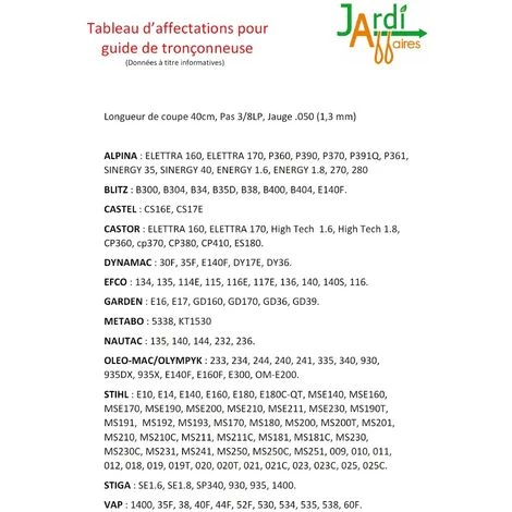 Guide Oregon 160SDEA074 longueur de coupe 40cm, Pas 3/8 Low Profil, Jauge 1,3mm gĂ©nĂ©ralement montĂ© avec une chaine de 55 maillons entraineurs (dents qui entrent dans le guide). Ce guide se monte essentiellement sur ALPINA, BLITZ, CASTEL, CASTOR, DYNAMAC, GARDEN, METABO, NAUTAC, OLEO MAC, STIHL, STIGA et VAP… ATTENTION : Merci de respecter nos affectations par marque et modèles de tronçonneuse (photos sur la fiche produit) Version avec guide et chaine professionnels Ă©galement disponible (160SXEA074)