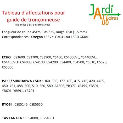 Guide Oregon 188VXLGK041 (Versacut) pour tronçonneuse longueur de coupe 45cm Pas 325, Jauge 1,5mm (058), généralement monté avec une chaine de 72 maillons entraineurs (dents qui entrent dans le guide). Ce guide se monte principalement sur ECHO, SHINDAIWA, SDK, ISEKI, TANAKA et Ryobi. Il peut se monter en remplacement d’un modèle Oregon 188SLGK041 ou d’un guide d’origine ECHO référence X125000151. ATTENTION / Merci de respecter notre tableau d’affectation par marque et par modèle de tronçonneuse (photo) ou de nous contacter en cas de doute pour votre tronçonneuse.